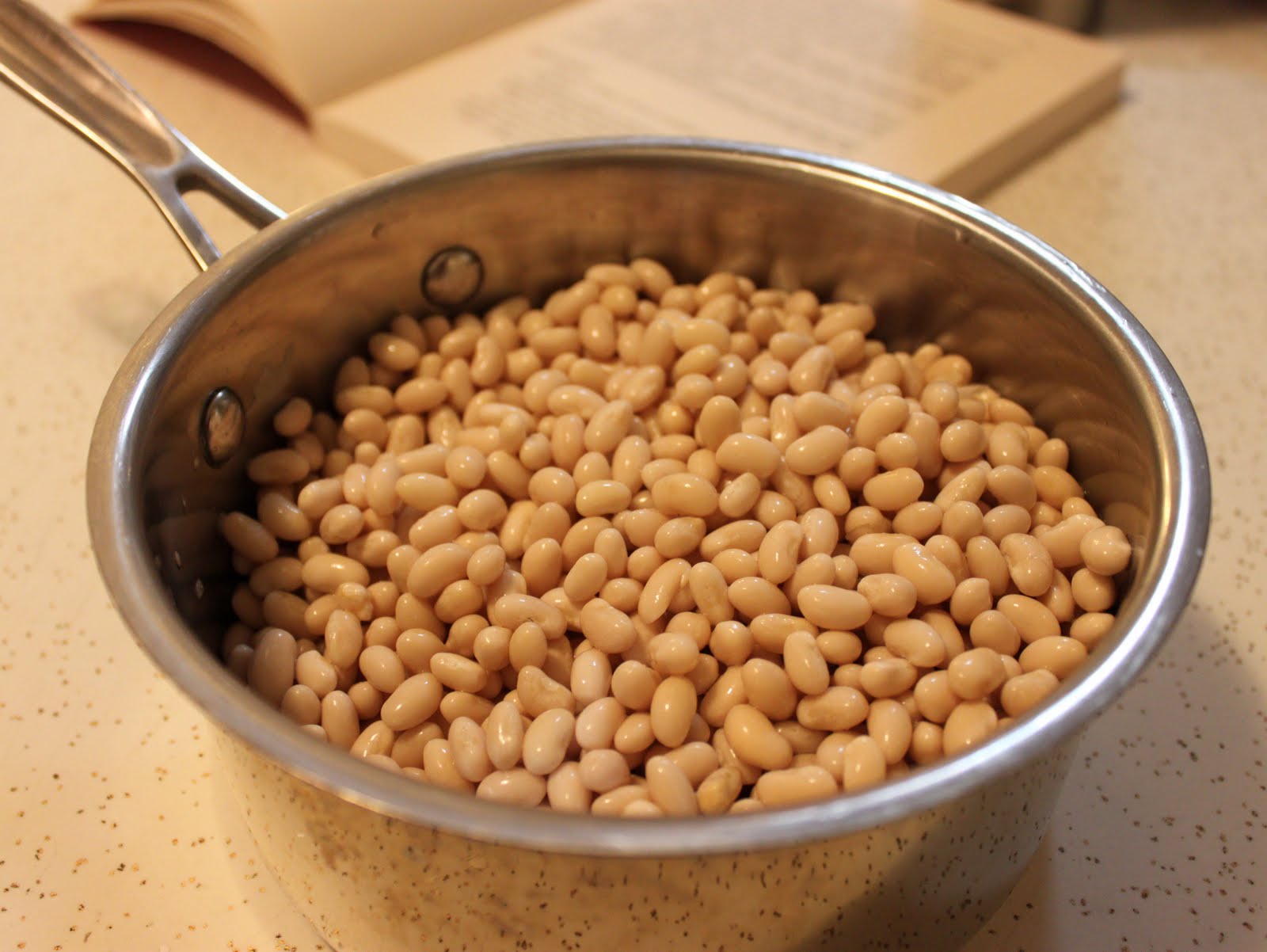 So, night one: after the beans were finished soaking, I simmered them in a new batch of water for 40 minutes and poured in half a teaspoon of baking soda, which sent up a nice fizz of bubbles when it hit the beans. Then the beans had to simmer for 30 more minutes, this time with 1/4 pound of salt pork thrown in for good measure. It felt a little like the beans were taking the best bath of their lives, and I was the attending servant. They ended their night in the refrigerator, stored in an enameled casserole dish.