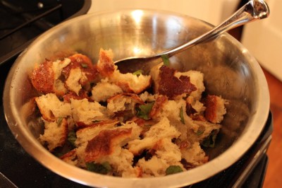 We did find a bright green, plastic serrated knife in the drawer, so Josh sawed away at the bread in a manly fashion while I assembled other ingredients. Then, instead of grating the bread into teeny tiny little crumbs like Walker instructs (this seemed like it would lead only to madness and sliced-up hands), I tore it into little pieces and tossed it with the melted butter, a tablespoon of chopped fresh sage, and a sprinkle of salt and pepper.