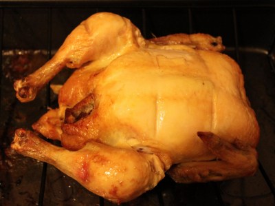 And yet: despite the lack of knives; despite eating at 9:00 at night because I had once again forgotten to backwards-time the project; despite neglecting to make the gravy because the giblets weren’t included and there wasn’t any flour; the chicken was delicious. Succulent, juicy, full of flavor. It might be better than my stand-by roasted chicken recipe. Even Josh approved.