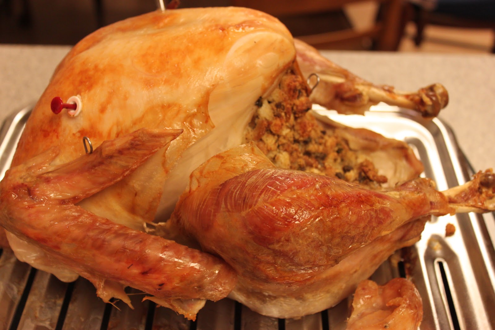 Now, technically the stuffing was the only truly historical food in this recipe. My dad closed the openings with little metal skewers instead of sewing them shut, and he covered the bird in aluminum foil to keep in the moisture. It was pretty funny to see the finished bird with all sorts of metal and temperature contraptions sticking out of it.