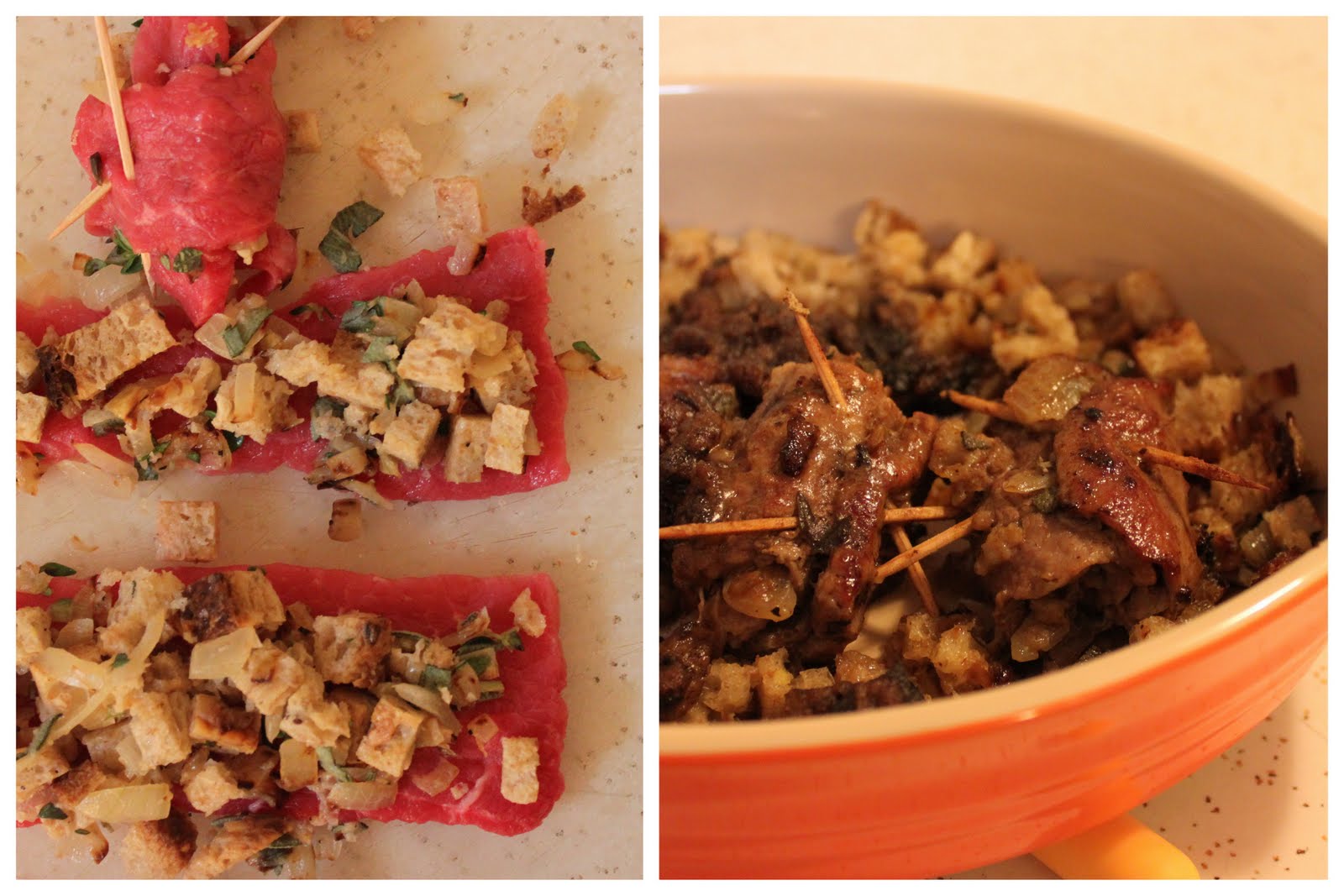 See, you roll up thin strips of veal and stuffing, then secure the rolls with toothpicks inserted crosswise. The resulting meat looks a little like partridges (or any bird) that have been trussed for roasting. Personally, I thought they looked more like pigs in a blanket, but I had a pretty good feeling those hadn’t been invented yet in colonial America.