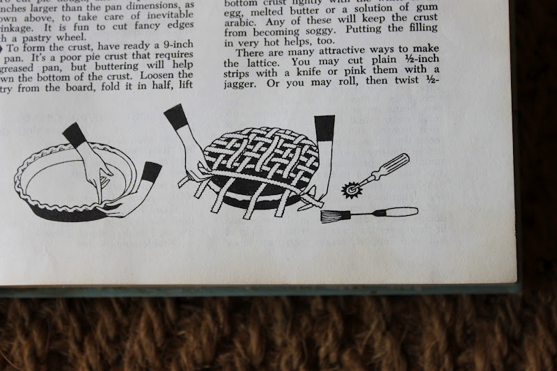 Roll out the second ball of dough as you wish. I like to make a lattice crust: roll out the dough into an oblong shape and use a knife to cut the dough into long strips about ½ inch wide. (See vintage 1960s diagram at left.)