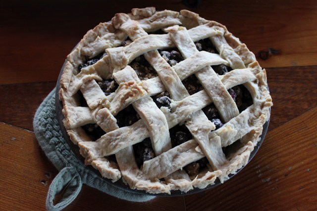 The first report is on an old classic that I’ve presented here before: blueberry pie. We always make a blueberry pie at the island, often with berries we picked ourselves. Sadly, there weren’t any berries growing when we arrived, so we made do with store-bought. And since there wasn’t any white sugar at our tiny local grocery store, I turned it into a brown sugar pie. But the family, fresh from swimming, pronounced it delicious.