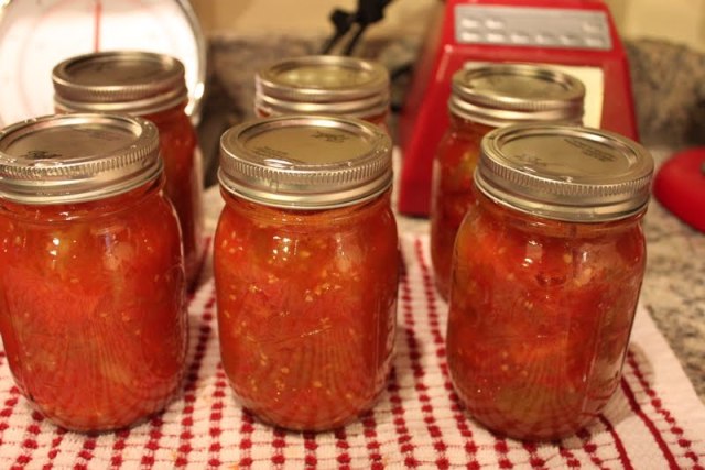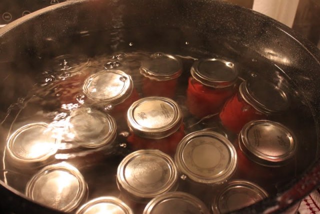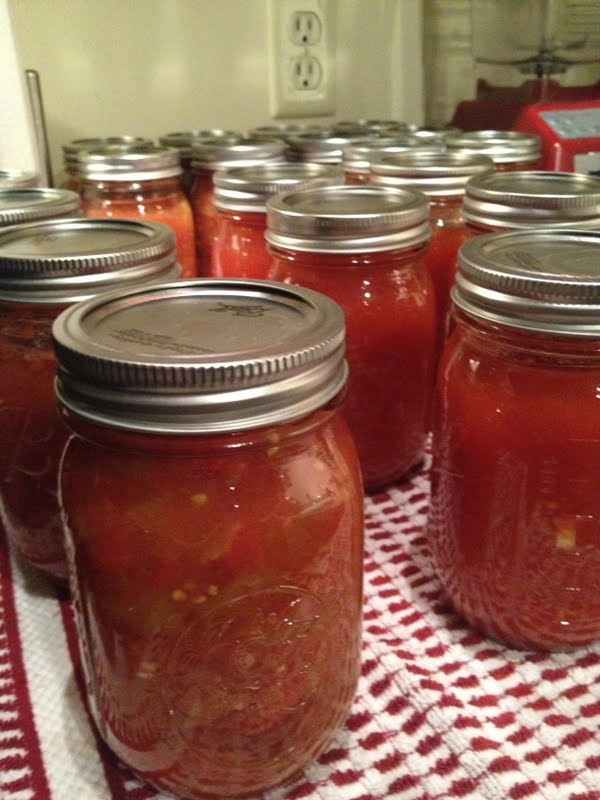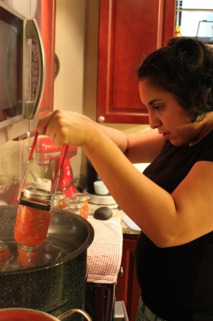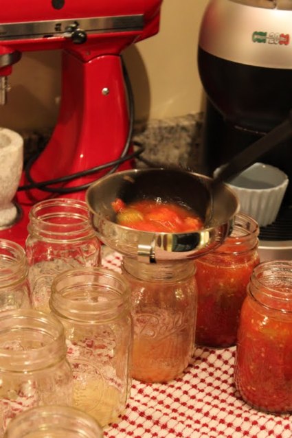 Nevertheless, we persevered. Once the crushed tomatoes had boiled, we started ladling them into our sterilized Mason jars (prepped with lemon juice to prevent evil bacteria from forming. Botulism is no joke).