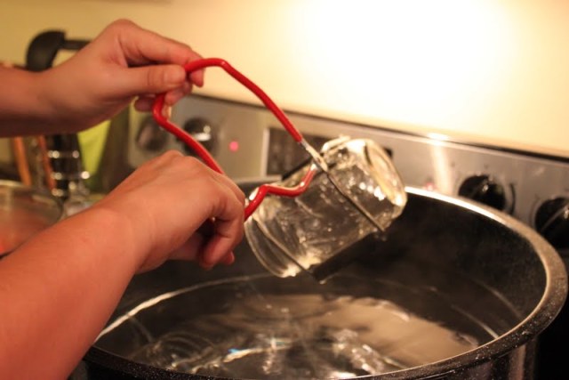 Then came the fun part: lowering the filled jars back into the boiling water of the canning pot. This is what seals the jars and prevents more bacteria from forming.