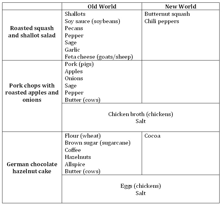 So, because I can’t leave well enough alone, I decided to cook a Columbian Exchange dinner. What kind of meal could I make using ingredients found mostly at my farmers’ market? What would that tell me about the extent of the Exchange?