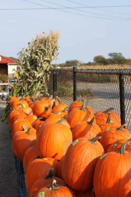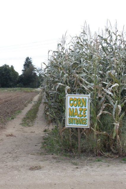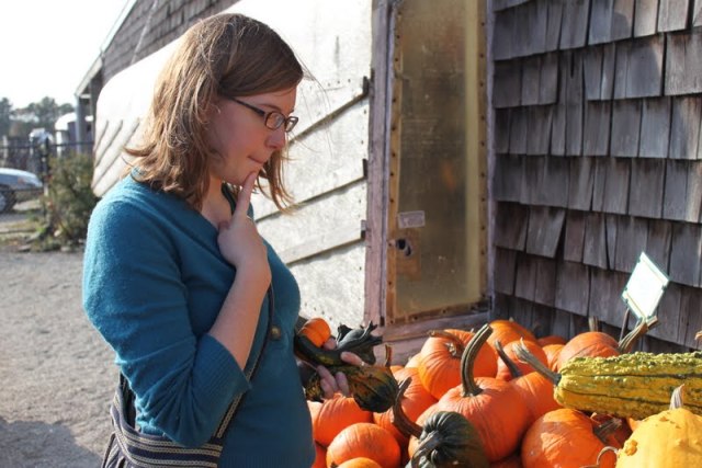 Last weekend, filled with the spirit of fall, Josh and I headed out to Seekonk to pick pumpkins. The pumpkin picking itself was majorly disappointing; picture a field dotted with pumpkins already plucked from the vine, so little kids didn’t have to work too hard. But we had fun walking around the farm, getting lost in the corn maze, and talking to goats. (Josh hates goats, by the way–the shape of their pupils makes them look evil or something.) Then we loaded up on carving pumpkins, decorative gourds, and a sugar pumpkin for baking.