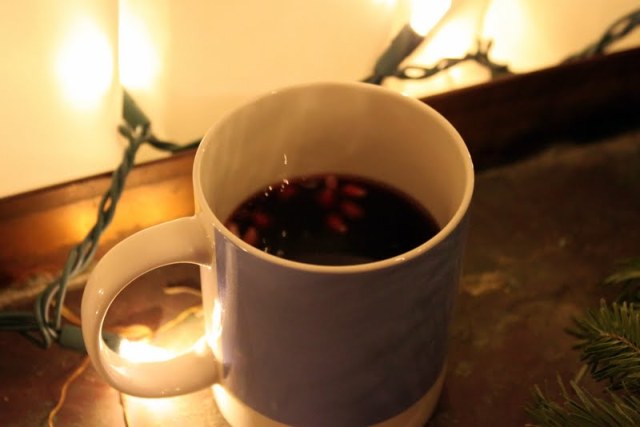 Place the tangerines, cinnamon sticks, and orange peel in the wine mixture. Heat until steaming, then cover and turn the heat down to low. Serve after twenty minutes, garnishing with pomegranate seeds (if using), and keep warm for second (or third!) servings.