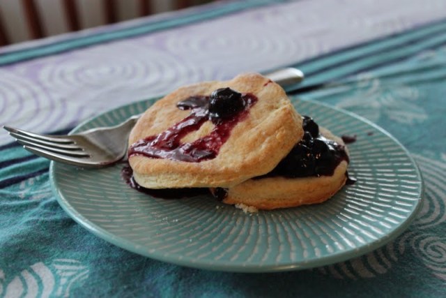 Split each biscuit in two and drizzle blueberry topping on one round, placing the plain round on top. Drizzle more blueberry sauce on top, or sprinkle with sugar.
