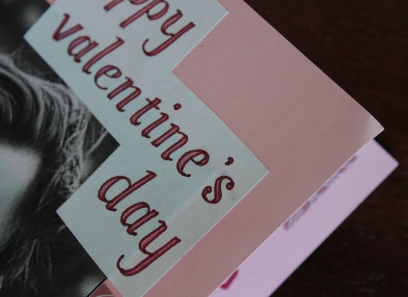 I took advantage of the quiet weekend to make some Valentine’s crafts. My sister and I have this funny tradition: every Valentine’s Day we mail each other fake cards from celebrities. So in the days leading up to the holiday, I haul out my pretty papers and rubber cement and troll the Internet for a handsome photo of Lissa’s latest celebrity love. (Or of someone who could pass for a celebrity love. Sometimes we have to get creative.)