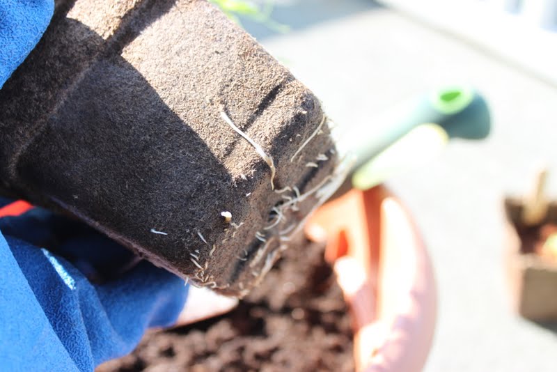 Now that the weather is warming up, I’m slowly getting the plants ready to go outside. This is a process called hardening off, and you have to take the plants outside in the sun over a period of days, letting them stay out longer each time to get used to wind, sun, and fresh air. I’ve also started moving some of the biggest starts into actual containers for the official growing season. (You can see the results of using Cow Pots below–the roots just grow right through the pots!)