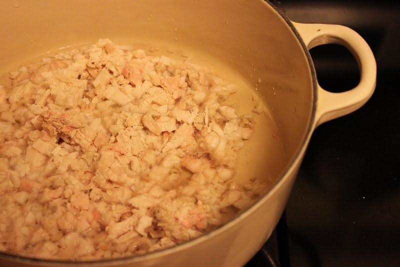 2. Place a heavy Dutch oven over medium-low heat. Pour in enough water to cover the bottom of the pot, and place the diced fat in the pot.