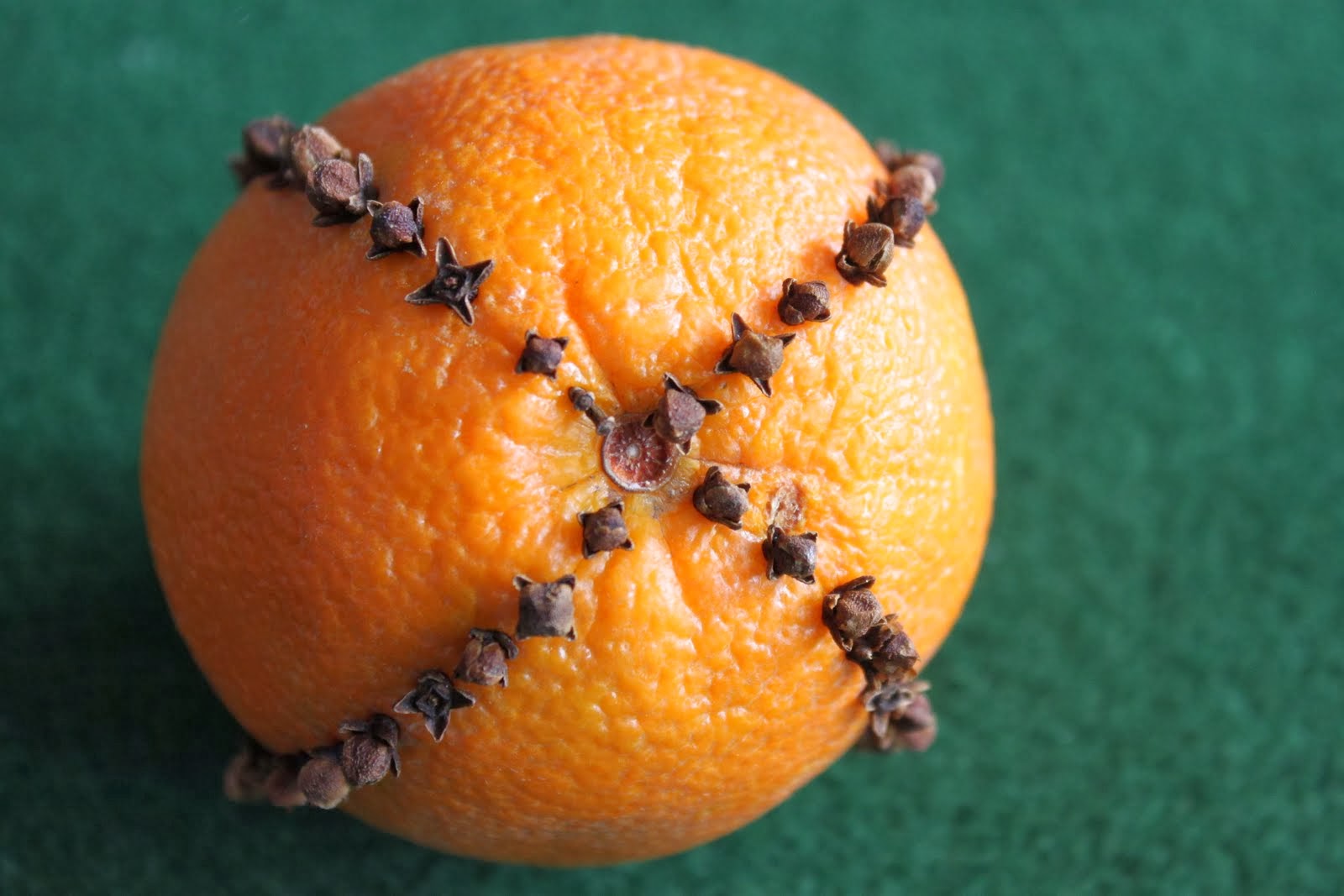 Press the whole cloves, sharp side down, into the fruit. You can make a pattern, or if you’d like the pomander to last as long as possible, keep the cloves close together and cover the fruit with them.