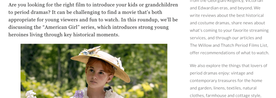 This week over at Willow and Thatch, I'm reviewing the American Girl movies for anyone interested in family-friendly period films. You could say that the American Girl dolls and books were one of my first introductions to history when I was growing up, so this post holds a special place in my heart. You can… Continue reading Guest Post: American Girl Series